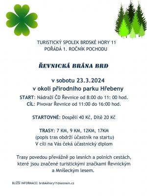 Turistický spolek Brdské hory 11 pořádá 1.ročník pochodu Řevnická brána Brd. Sraz mezi 8 a 11 hod. na nádraží ČD v Řevnicích.