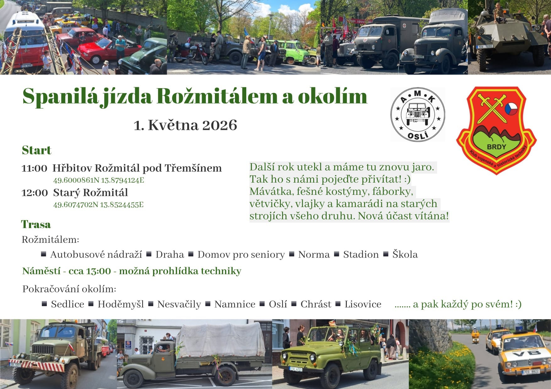 odstartuje v 11:00 od hřbitova v Rožmitále pod Třemšínem a ve 12:00 ze Starého Rožmitálu. Tam se k ní připojí starorožmitálský Retro prvomájový průvod, který začne ve Starém Rožmitále také v 11:00. Společná trasa pak povede přes autobusové nádraží, draha, kolem domova důchodců, Normy, kolem stadionu a školy a zhruba ve 13:00 bude možná prohlídka techniky na náměstí. Poté bude spanilá jízda pokračovat přes Sedlici, Hoděmyšl, Nesvačily, Namnice, Oslí, Chrást a Lisovice.
