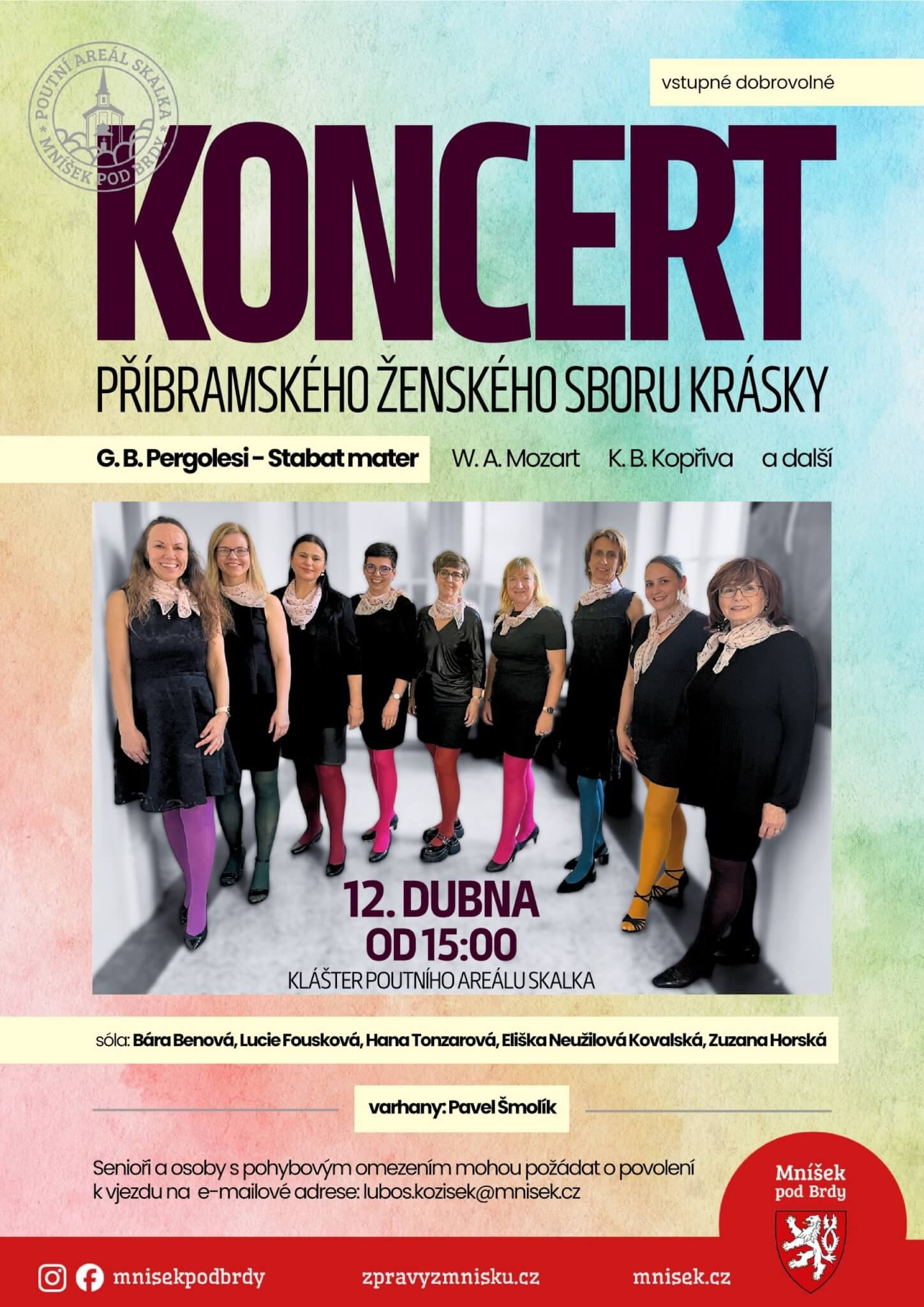 V neděli 12. 4. v sále kláštera vystoupí příbramský ženský sbor KRÁSKY, jedná se o poloprofesionální těleso, jehož počátky se datují od ledna 2012, pravidelně koncertují v období Velikonoc, Adventu a Vánoc. V repertoáru udržují lidové trojhlasé písně a skladby, roráty, pastorely, koledy, ale zvládají i náročnější kompozice – Mozartovo Requiem, Dvořákova mše D dur Lužanská (za doprovodu Příbramské filharmonie). V posledních letech pravidelně zaznívá úžasné dílo Stabat mater, jehož autorem je skladatel J. B. Pergolesi. Na koncertě na Skalce uslyšíte skladby W. A. Mozarta a K. B. Kopřivy, vše doprovodí na varhany svatohorský regenschori Pavel Šmolík.