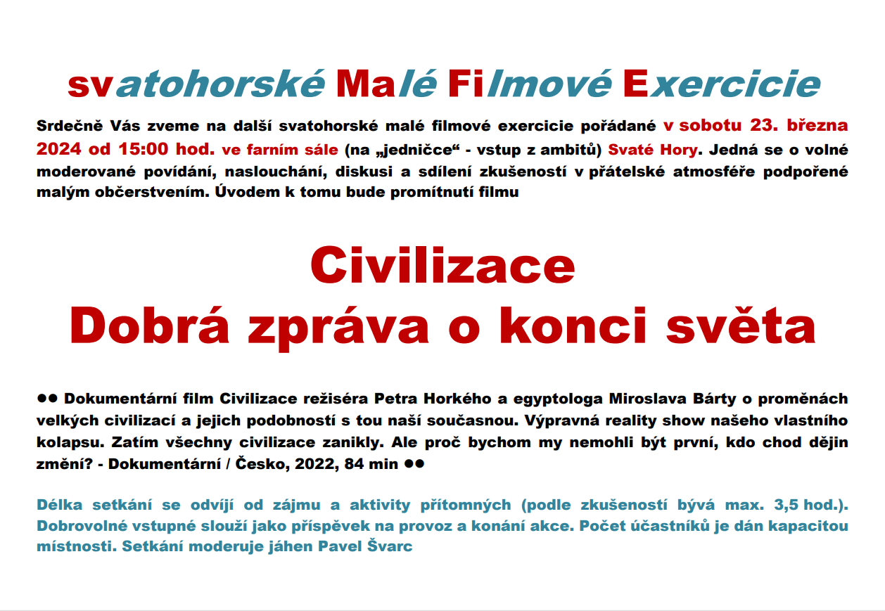 Úvodem k bude promítnut film Civilizace – Dobrá zpráva o konci světa.